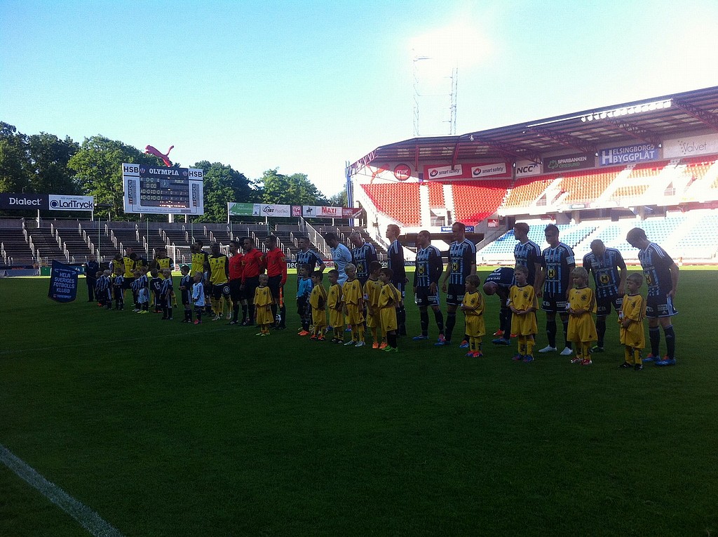 Förstärkta av P07 och P 09/10 marscherade P 08-knattarna ut till line upp när Ängelholms FF på måndagen tog emot Husqvarna på Olympia. Men först blev det en och annan "high five" i spelargången med både hemma- och bortaspelare.
