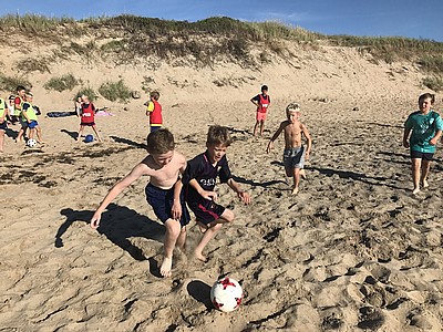 Efter en stunds strandfotboll och ett svalkande dopp avslutades kvällen med en match mellan föräldrar och P9-spelare.